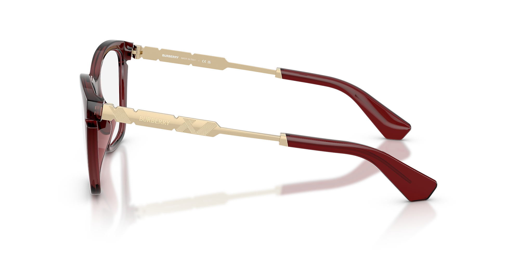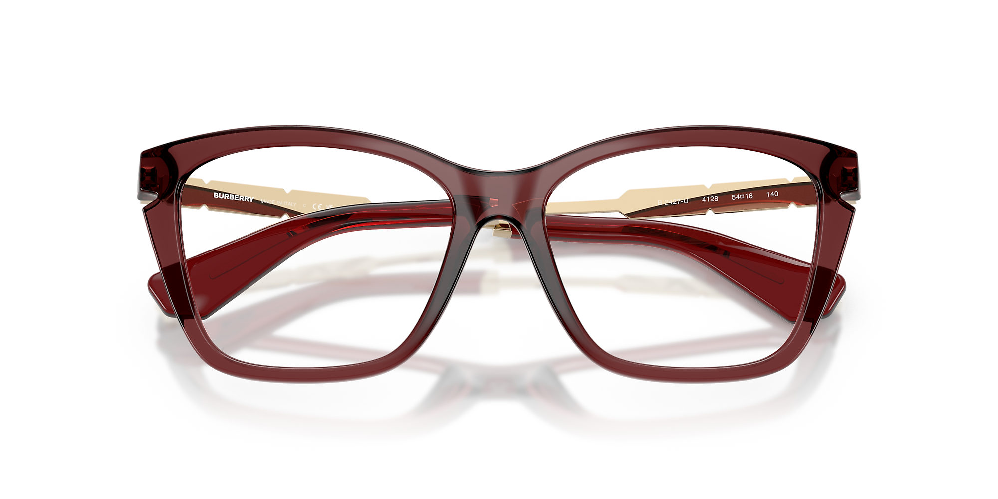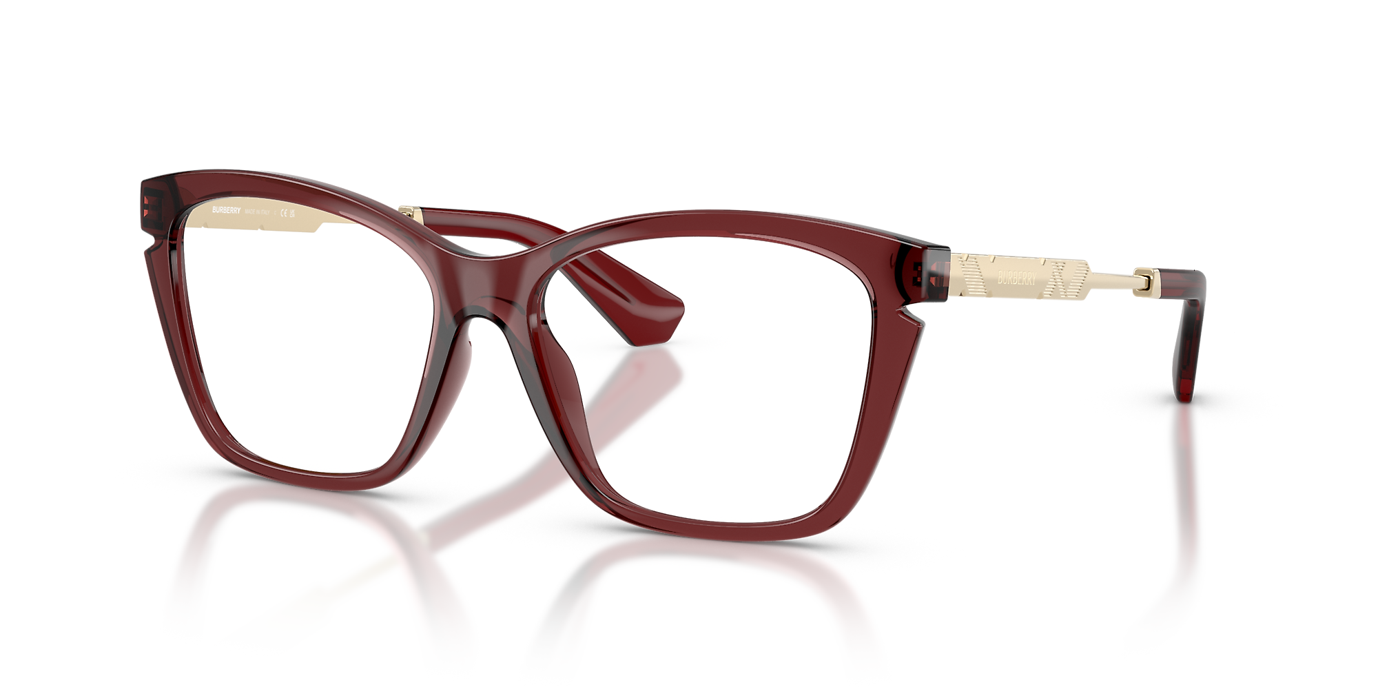 Embrace the elegance and sophistication of Burberry BE2427U eyeglasses. These cat-eye-shaped frames, crafted from polished bordeaux acetate, are a timeless choice for those seeking a fashion-forward look. The unique color combination and design make these glasses a standout accessory for any outfit. With their superior quality and impeccable style, these frames are sure to turn heads. Available with prescription lenses.