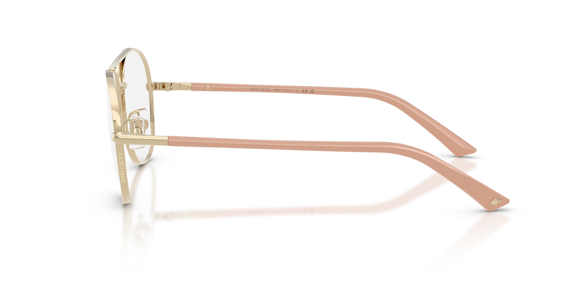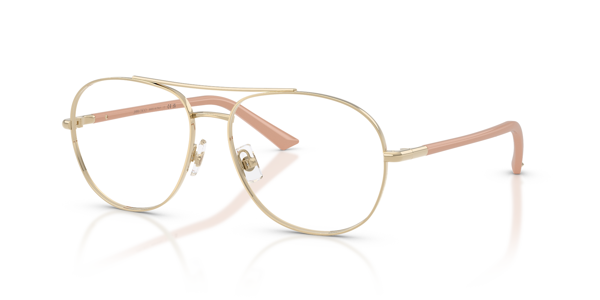 Elevate your optical style with the Jimmy Choo JC2021. These full-rim pilot glasses feature a sculptural double bridge and engraved rims, blending lightweight metal construction with effortless sophistication. Finished with a gold front and diamond-accented temples, this design embodies refined glamour for adults seeking timeless elegance. Adjustable nose pads ensure a comfortable fit.