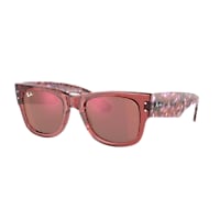 Elevate your style quotient with Ray-Ban Mega Wayfarer sunglasses. Crafted from durable material, these shades feature a polished, transparent pink frame in a square shape that adds a modern touch to the iconic design. The mirror treatment on the lenses not only enhances their visual appeal but also provides superior protection against glare and harmful UV rays. With their striking red color and unique design, these sunglasses are sure to turn heads wherever you go. Available with prescription lenses.
