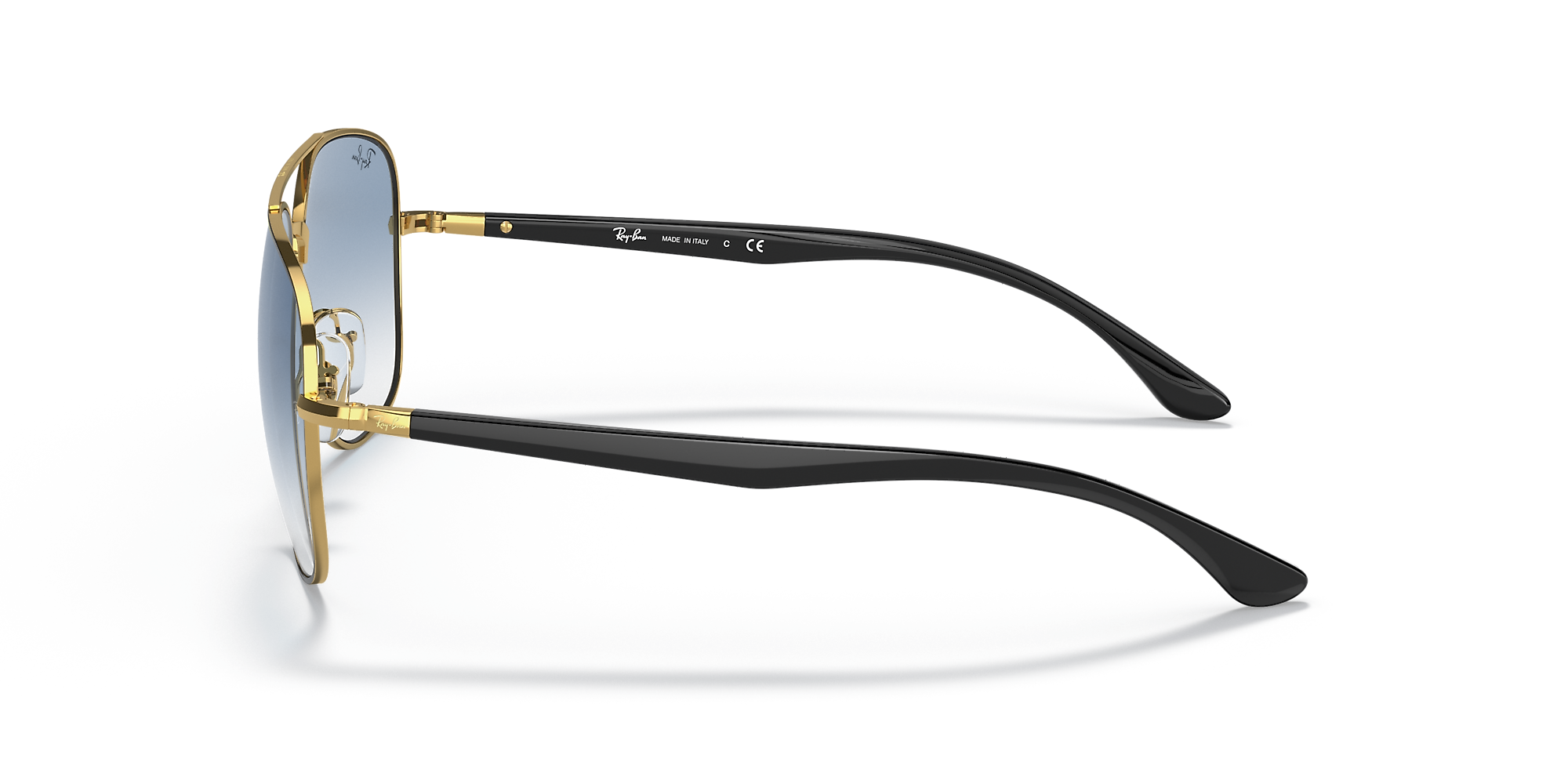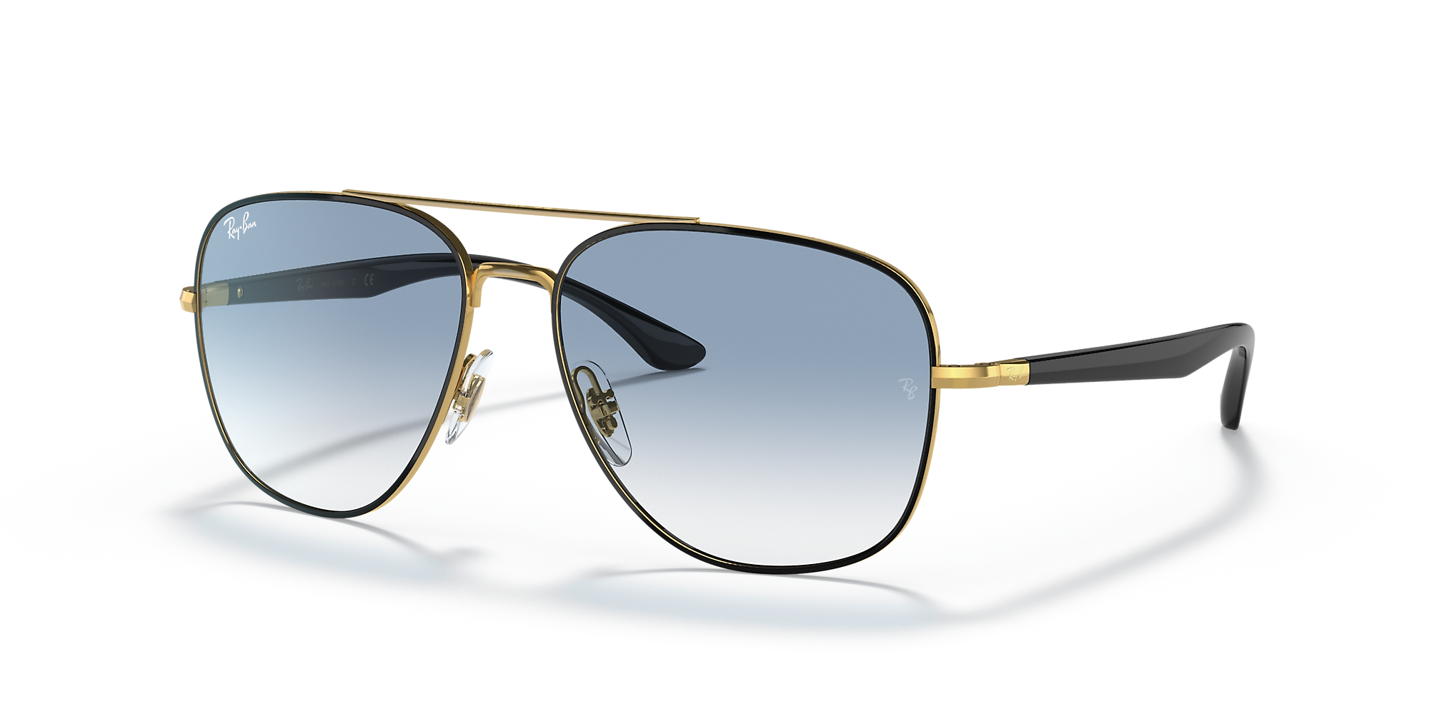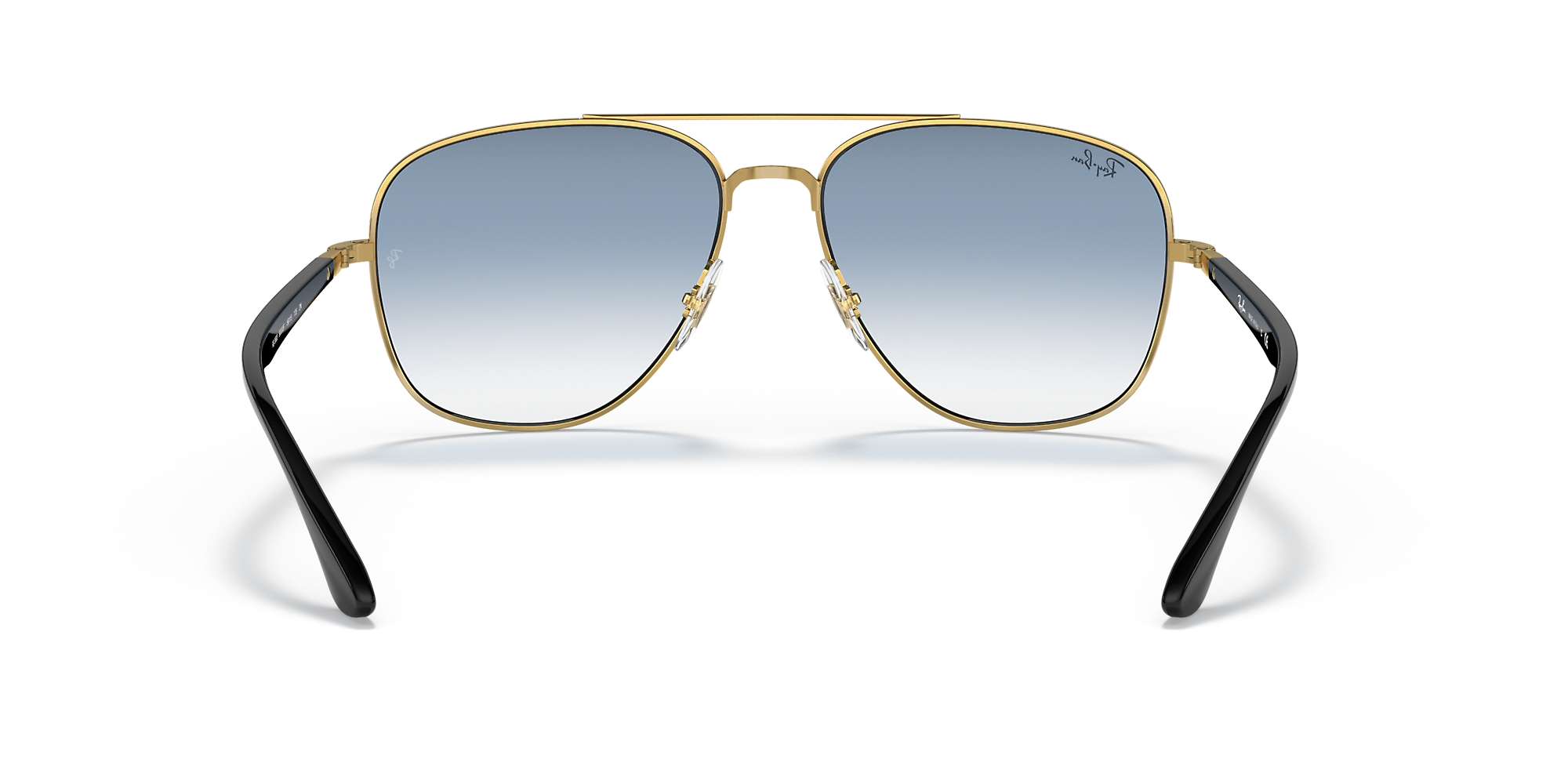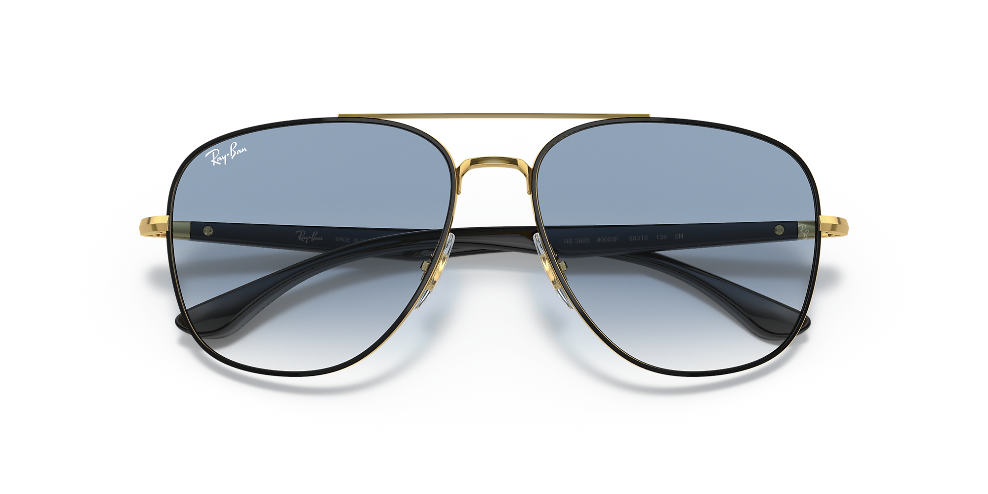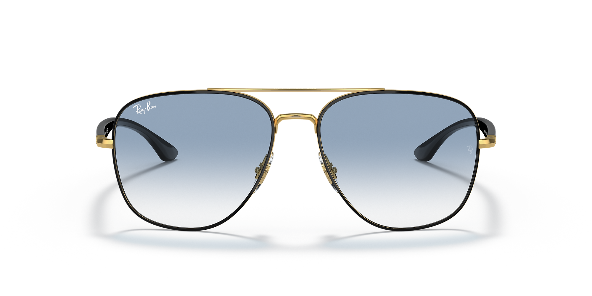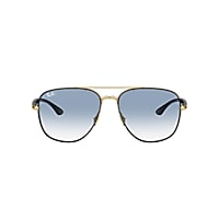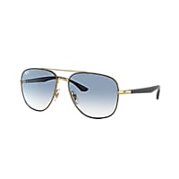 Elevate your style with Ray-Ban RB3683 sunglasses. The square shape and polished black on gold metal frame offer a modern and sophisticated look. The gradient blue lenses add a pop of color, while the gradient treatment provides smooth transitions from a darker shade at the top to a lighter one towards the bottom. These shades are not only stylish but also practical. Available with prescription lenses.