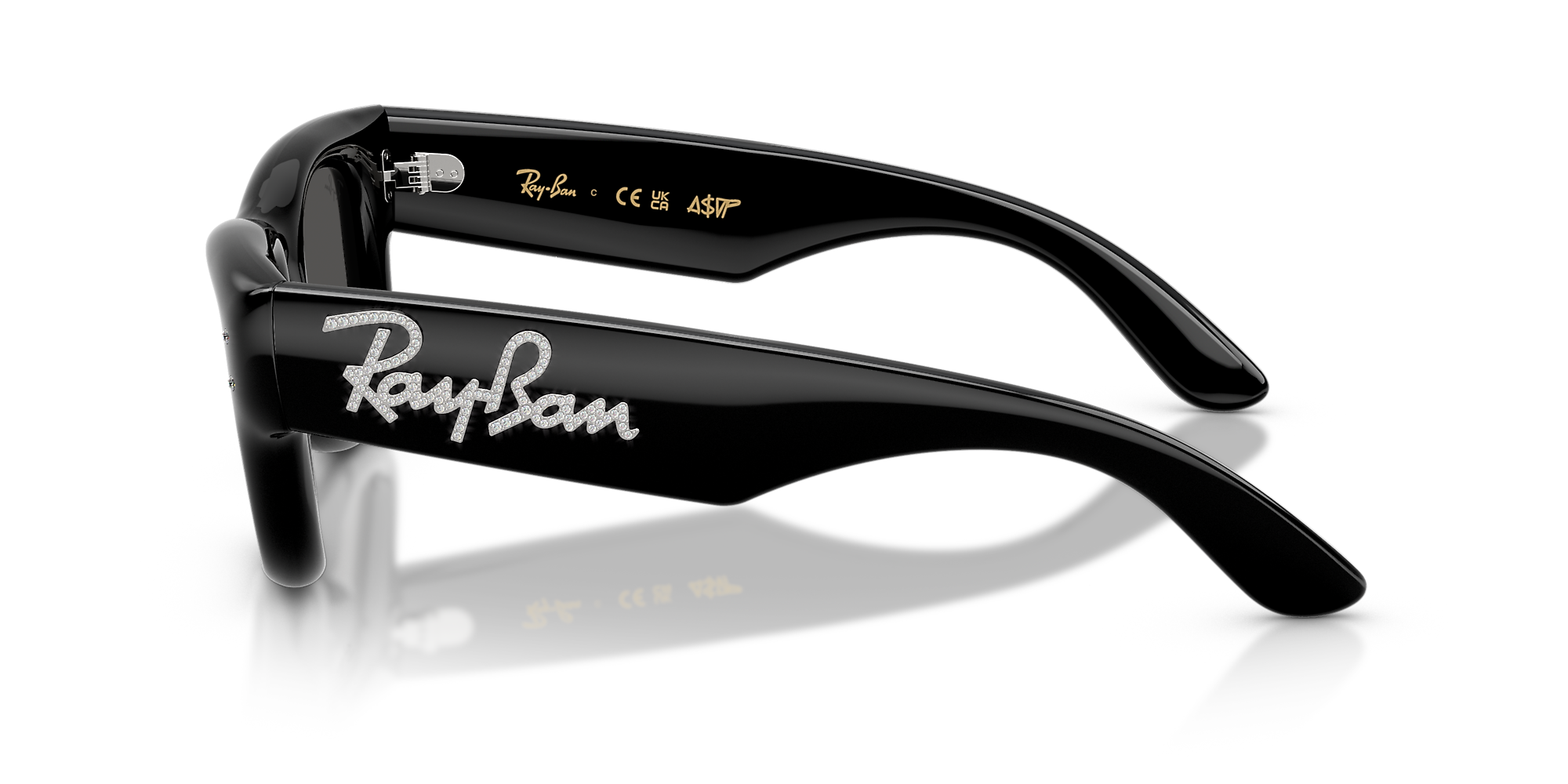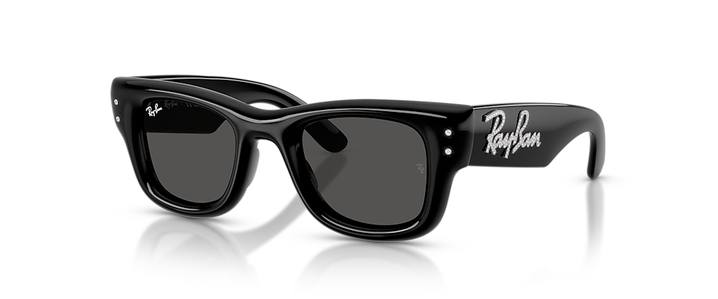Elevate your style with Ray-Ban Wayfarer Puffer Crystal Edition sunglasses. These square-shaped glasses feature a polished black and strass frame, offering a sleek and sophisticated look. The lenses are solidly colored in dark grey, providing optimal protection against the sun's rays. The puffer crystal detail on the temple adds an element of luxury to these shades. Discover the timeless appeal of Ray-Ban Wayfarer sunglasses.